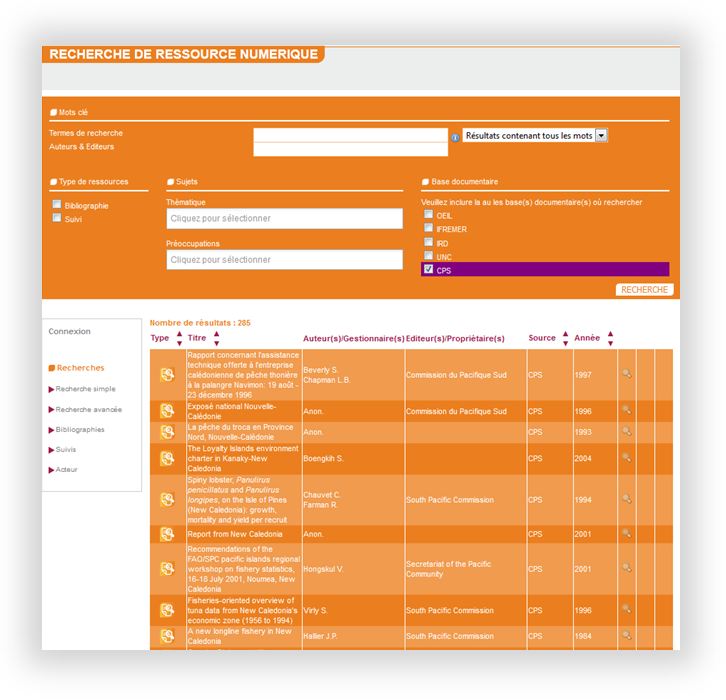Jusqu'alors, le centre documentaire de l'OEIL moissonnait une partie des bases de l'Ifremer, de l'IRD et de l'UNC. Depuis juin 2015, il moissonne la base documentaire de la CPS donnant ainsi accès à 285 références supplémentaires.