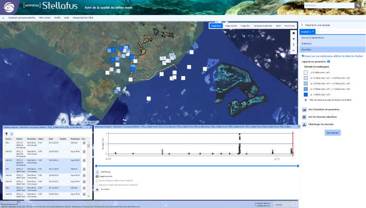 Stellatus est un portail de consultation des données environnementales sur la qualité du milieu marin dans la zone d'influence de Vale Nouvelle-Calédonie. Pour évaluer la qualité de l'eau de mer, il est nécessaire de regarder plusieurs paramètres (biologiques, physiques, chimiques, etc.). |