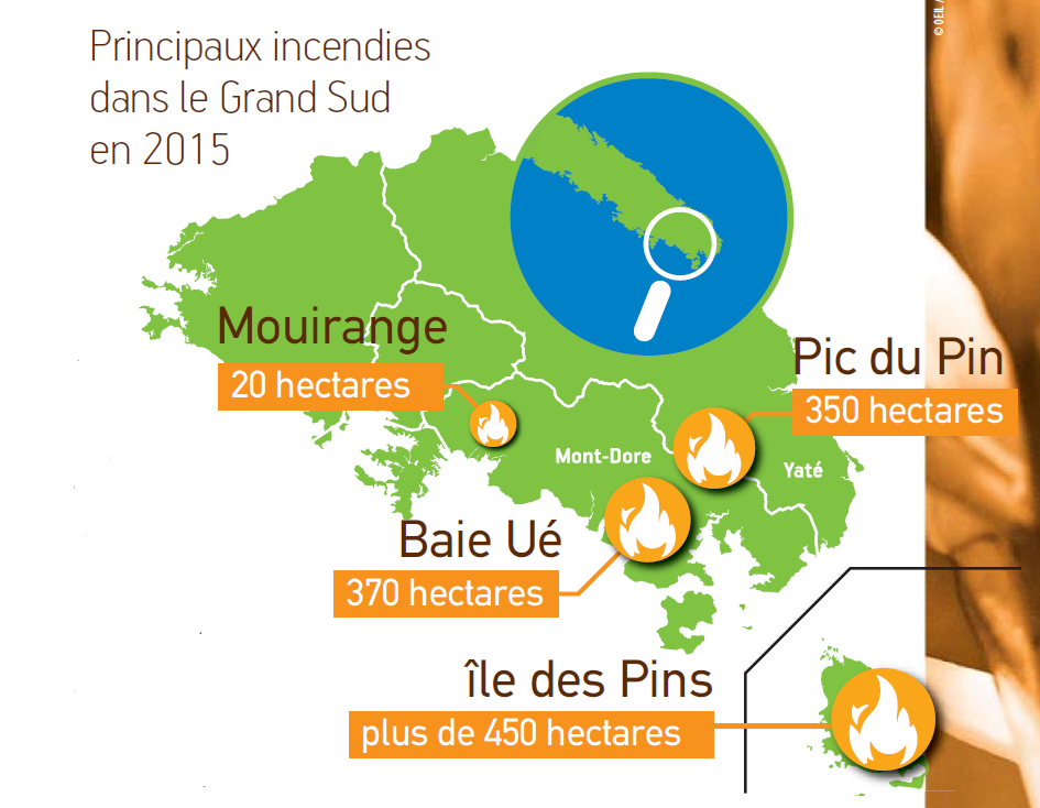 Les incendies constituent l’une des principales causes de destruction de la biodiversité sur notre territoire. Le Grand Sud a subi quatre feux majeurs en 2015 : baie Ué (370 ha), Pic du Pin (350 ha), île des Pins (plus de 450 ha) et Mouirange (20 ha). Au total, c’est près de 1 200 hectares qui ont brûlés sur les communes du Mont-Dore, de Yaté et de l’île des Pins. En septembre 2016, l’île des Pins a connu un incendie majeur. De la tribu de Touété à l’ouest d’Oro, le feu s’est propagé sur plus de 1 000 hectares, soit près d’un dixième de l’île.