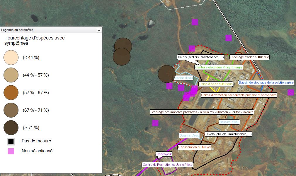 La situation est mauvaise dans la zone de l'usine. Les rejets de dioxyde de soufre dans l’atmosphère ont engendré l’apparition de symptômes sur les feuilles des arbres dans les zones les plus exposées - situées directement sous les vents dominants, à une distance comprise entre 200 et 1 900 mètres de l’usine. Malgré la présence de ces symptômes visibles depuis 2011 sur la zone de l’usine, de nouveaux feuillages en bonne santé, ainsi que de nouvelles floraisons et fructifications ont été observés sur certaines espèces.