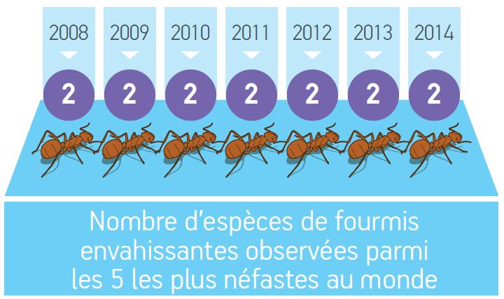 Les fourmis envahissantes représentent des menaces pour la biodiversité calédonienne. La fourmi électrique et la fourmi folle jaune, par ailleurs bien connues sur le territoire néo-calédonien, sont observées à chaque campagne de suivi. Elles sont relativement stables : elles ne se propagent pas. Aucune nouvelle espèce de fourmi envahissante n’a été détectée depuis le début des suivis.