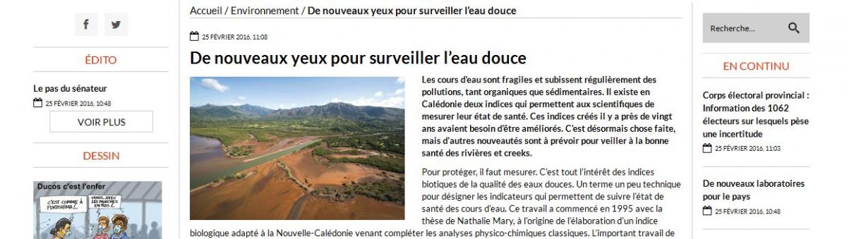 Les cours d’eau sont fragiles et subissent régulièrement des pollutions, tant organiques que sédimentaires. Il existe en Calédonie deux indices qui permettent aux scientifiques de mesurer leur état de santé. Ces indices créés il y a près de vingt ans avaient besoin d’être améliorés. C’est désormais chose faite, mais d’autres nouveautés sont à prévoir pour veiller à la bonne santé des rivières et creeks - See more at: http://www.dnc.nc/de-nouveaux-yeux-pour-surveiller-leau-douce/#sthash.ID...