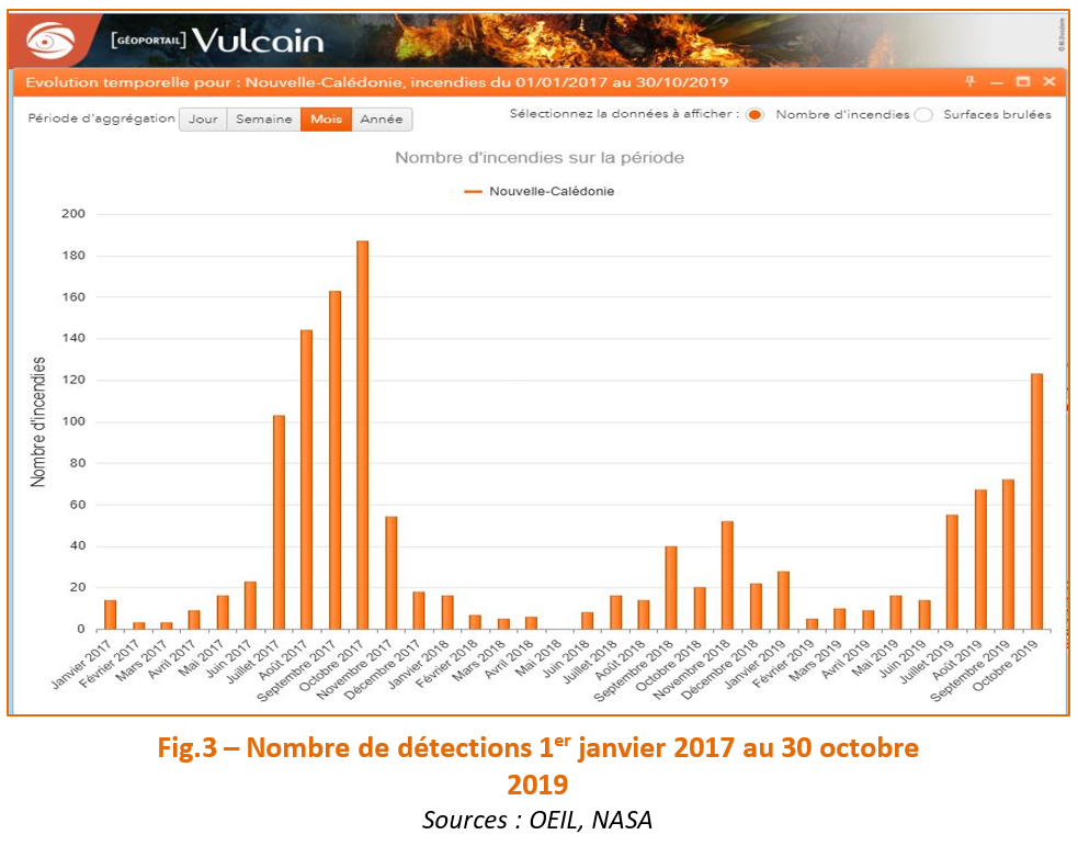 Le suivi par satellite opéré par l’OEIL fait état de 457 incendies détectés en date du 30 octobre pour l’année 2019, pour une surface d’environ 11 000 hectares brûlés (fig.1). A la même date l’année dernière, on en était à 139 événements, qui s’étaient étendus sur un peu plus de 3 000 hectares.