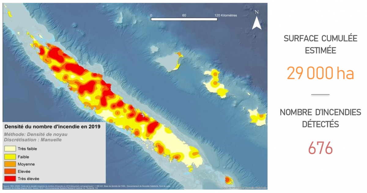Cette année encore, la province Nord est la plus touchée par le phénomène, comptabilisant 77% des surfaces brûlées. Elle est suivie de la province Sud qui a connu plusieurs incendies de grande ampleur, notamment à Moindou, Thio, et au Mont-Dore cette année, totalisant 22% des surfaces brûlées sur le territoire en 2019. Les surfaces brûlées en province des Îles, moins sujette à cette pression environnementale, représentent moins de 1% du total territorial.