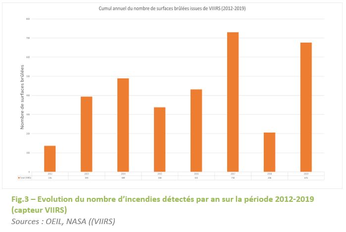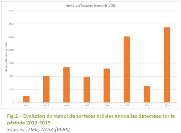 Le suivi par satellite opéré par l’OEIL fait état de 676 incendies détectés sur l’année 2019, pour un cumul de surfaces brûlées d’environ 29 000 hectares.
