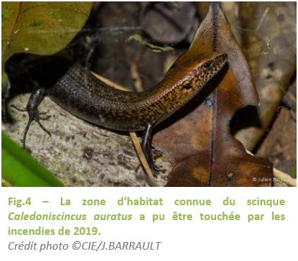 • le scinque Caledoniscincus auratus a vu son aire de répartition probablement touchée par le feu en 2019, il conviendra de prospecter sur le terrain pour déterminer si l’espèce est toujours présente.