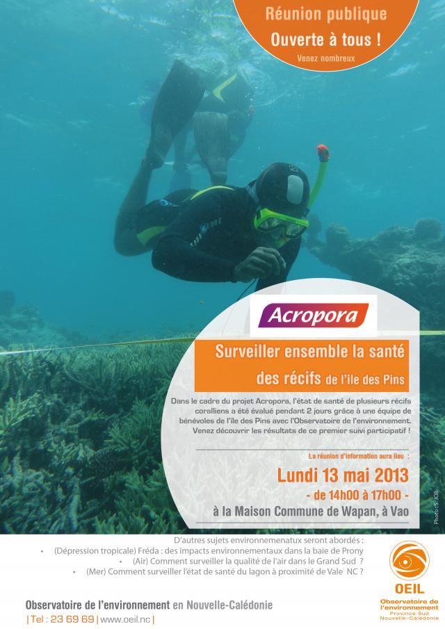 Accompagnée des bénévoles kuniés, l’équipe de l’Observatoire de l’environnement en Nouvelle-Calédonie (OEIL) présentera les résultats de la première année du projet ACROPORA, au cours d’une réunion publique ouverte à tous :