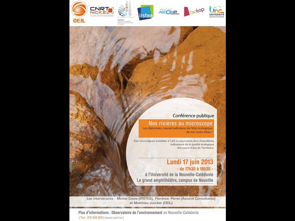 Date : Lundi 17 juin 2013 de 17h30 à 18h30Type : Conférence publiqueObjet : Surveillance de la qualité des eaux doucesLieu : Université de la Nouvelle-Calédonie, grand amphithéâtre, campus de Nouville. |