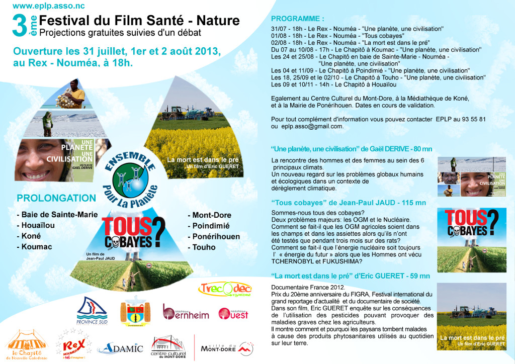L'association Ensemble pour la planète (EPLP) organise la troisième édition du Festival du Film Santé - Nature. Durant trois jours, les films seront projetés au Rex à Nouméa et suivront des projections en brousse (Mont-Dore, Koné, Ponérihouen, etc.) À cette occasion, trois films sont mis à l'honneur: "Une planète, une civilisation" de Gaël DERIVE - 80 mnLa rencontre des hommes et des femmes au sein des 6 principaux climats. Un nouveau regard sur les problèmes globaux humains et écologiques dans un contexte de dérèglement climatique. "Tous cobayes" de Jean-Paul JAUD - 115 mnSommes-nous tous des cobayes? Deux problèmes majeurs : les OGM et le Nucléaire. "La mort est dans le pré" d'Eric GUERET - 59 mnEnquête sur les conséquences de l'utilisation des pesticides pouvant provoquer des maladies graves chez les agriculteurs. Pour télécharger le programme complet, cliquer ici |