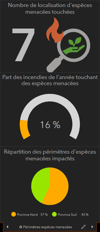 Impact des incendies sur les périmètres d'intéretsTrois onglets permettent d'accéder aux statistiques des principaux périmètres d'intérêts que sont les aires protégées, les périmètres de protection des eaux (situés en amont des captages), et les périmètres de protection des espèces menacées. On y retrouve ainsi les information suivantes :