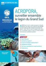 ACROPORA : surveiller ensemble le lagon du Grand Sud (Essentiel n°2 - Avril 2013)Initié fin 2012, le projet ACROPORA a pour objectif de faire participer les habitants des 3 communes du Grand Sud au suivi de l’état de santé des récifs coralliens. Voir la plaquette Voir les résultats : 2013 2014 2015 2016 2017 2018 2019 2023 |