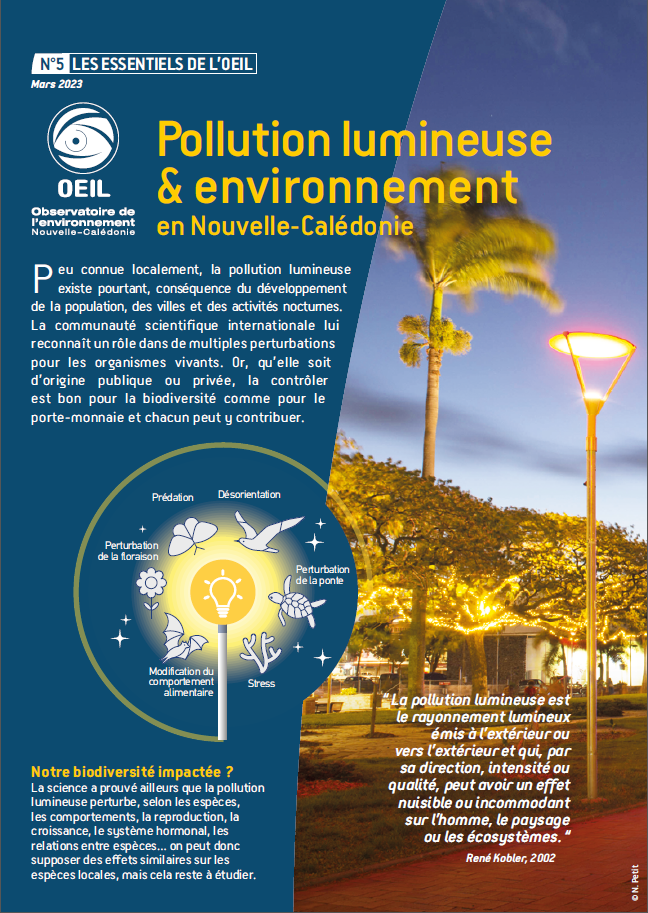 Pollution lumineuse & environnement en Nouvelle-Calédonie (Essentiel n°5 - Mars 2023)Peu connue localement, la pollution lumineuse existe pourtant, conséquence du développement de la population, des villes et des activités nocturnes. La communauté scientifique internationale lui reconnaît un rôle dans de multiples perturbations pour les organismes vivants. Or, qu'elle soit d'origine publique ou privée, la contrôler est bon pour la biodiversité comme pour le porte-monnaie et chacun peut y contribuer. |