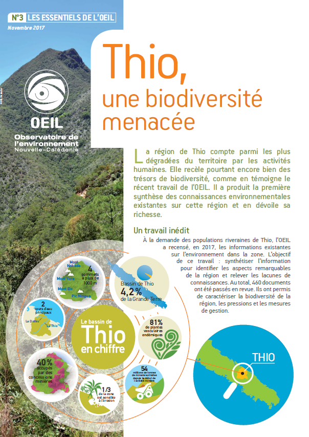 Thio, une biodiversité menacée (Essentiel n°3 - Novembre 2017)La région de Thio compte parmi les plus dégradées du territoire par les activités humaines. Elle recèle pourtant encore bien des trésors de biodiversité, comme en témoigne le récent travail de l’OEIL. Il a produit la première synthèse des connaissances environnementales existantes sur cette région et en dévoile sa richesse. Voir la plaquette |