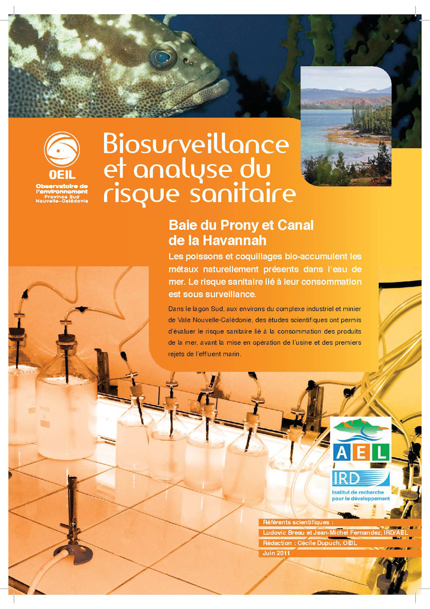 Biosurveillance et analyse du risque sanitaire (Juin 2011)Les poissons et coquillages bio-accumulent les métaux naturellement présents dans l’eau de mer. Le risque sanitaire lié à leur consommation est sous surveillance. Dans le lagon Sud, aux environs du complexe industriel et minier de Vale Nouvelle-Calédonie, des études scientifiques ont permis d’évaluer le risque sanitaire lié à la consommation des produits de la mer, avant la mise en opération de l’usine et des premiers rejets de l’effluent marin. Cette plaquette analyse ce risque en baie du Prony et Canal de la Havannah. Voir la plaquette |