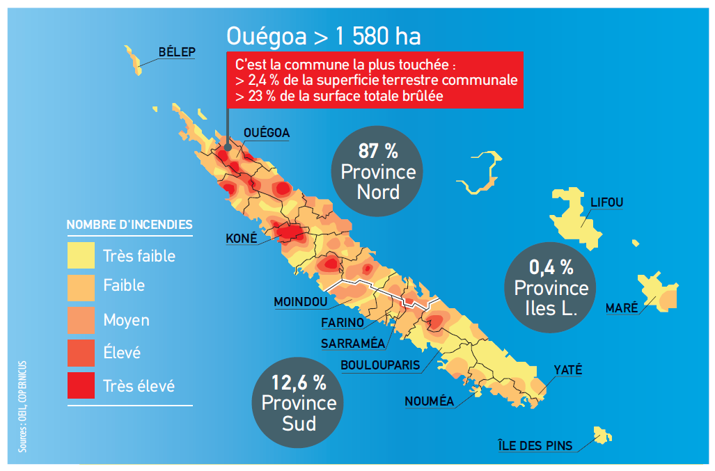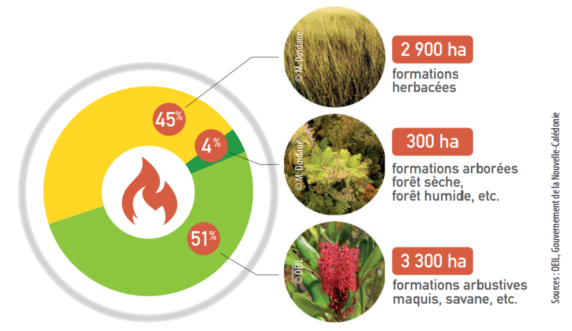 Les incendies sont une des principales menaces qui pèsent sur les milieux naturels en Nouvelle-Calédonie. En 2017, le premier bilan chiffré établi par l’OEIL rapportait 24 145 hectares brûlés, soit 1,3 % de la surface de la Nouvelle-Calédonie. L’année 2018 affiche un bilan presque quatre fois moindre avec 6 763 ha.