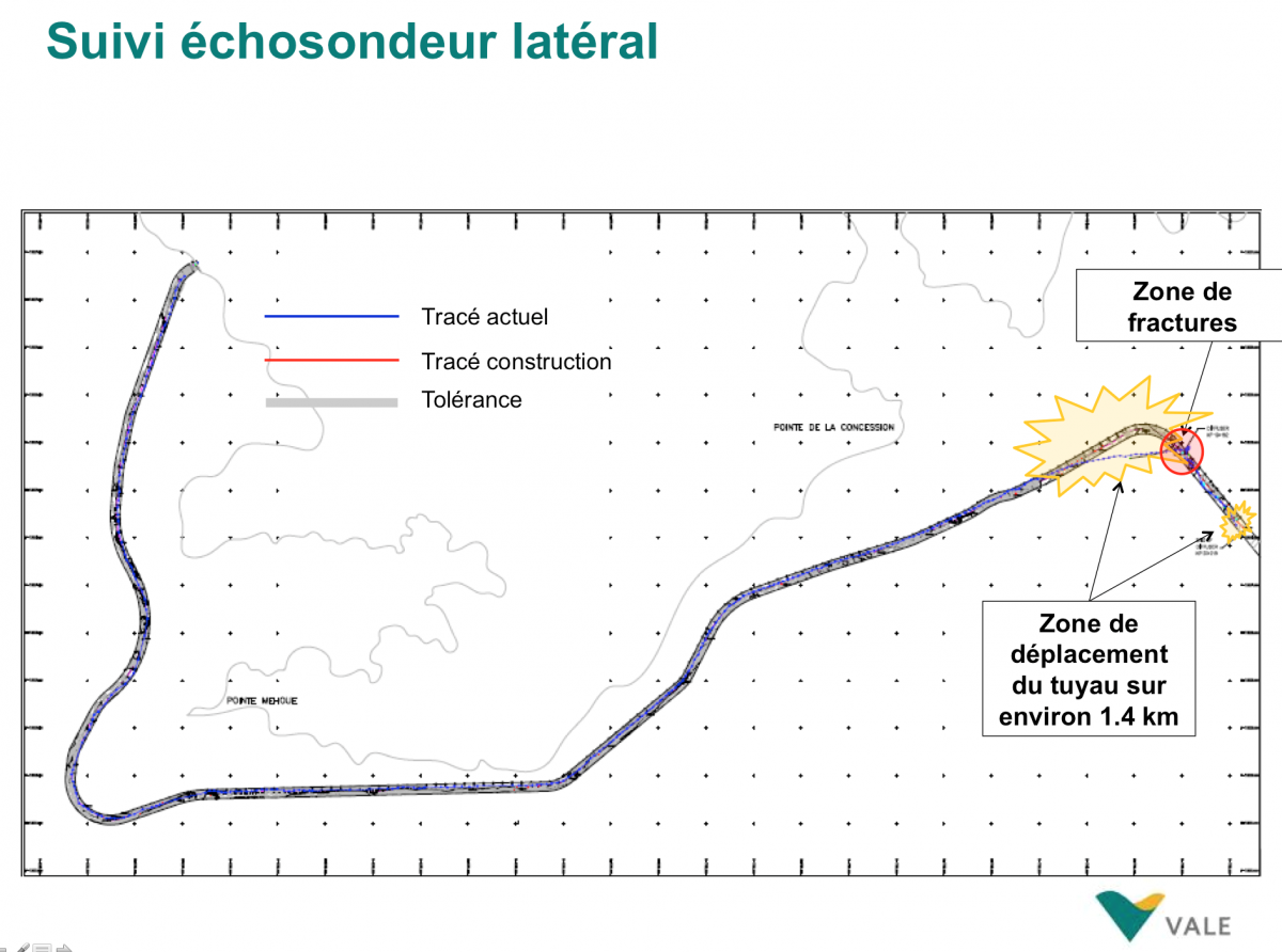 Depuis l’observation réalisée le lundi 11 novembre à 15h35 par le Betico, le tuyau n’a plus été observé en surface. Les inspections sous-marines réalisées par Vale Nouvelle-Calédonie sur le lieu d’incident ont permis de conclure les éléments suivants :