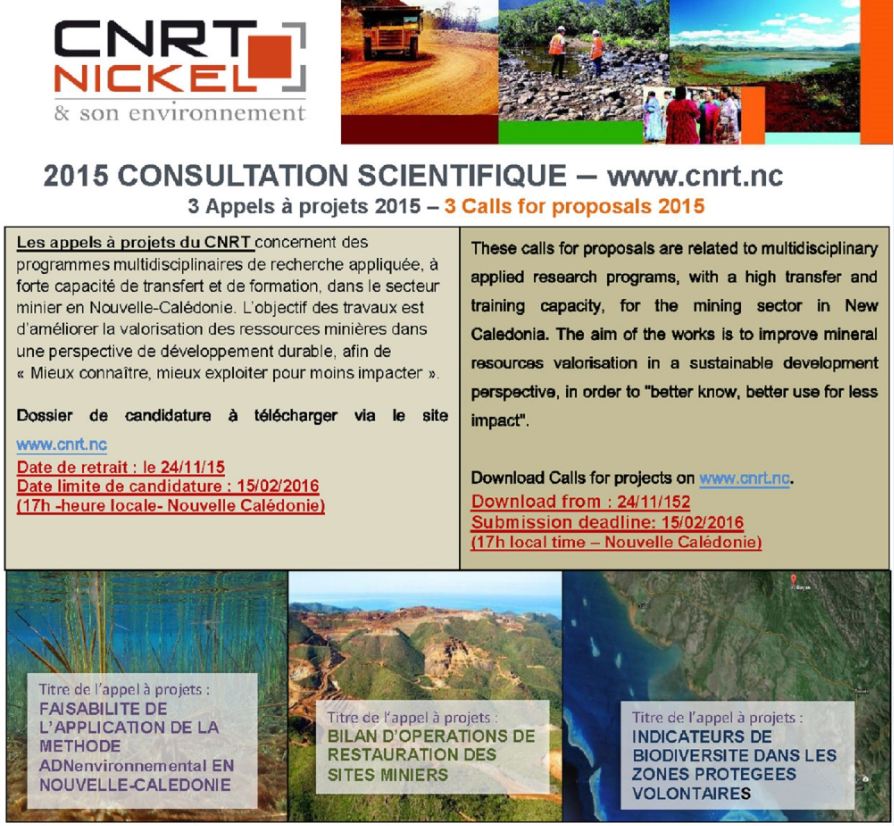 Dans le cadre de sa nouvelle programmation scientifique 2015, le CNRT a lancé 3 nouveaux appels à projets ouverts dans la thématique "Nickel et son environnement" (détails sur le site du CNRT) :