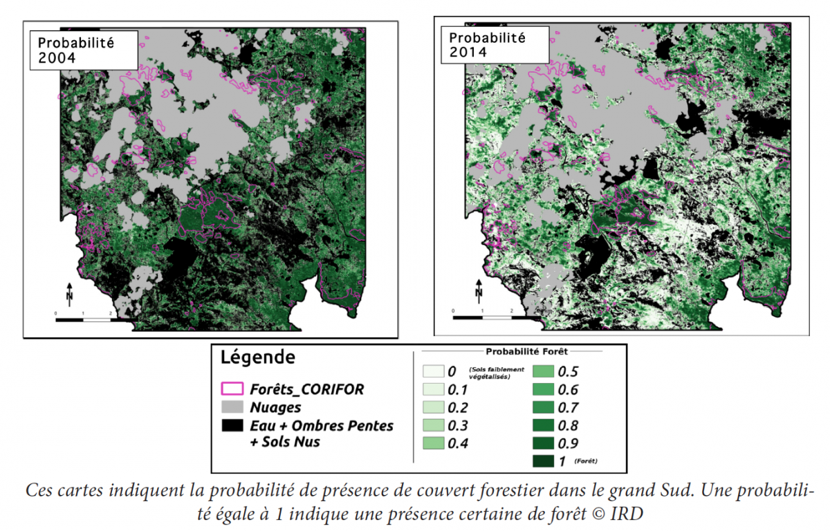 La robustesse de la méthode aux modifications radiométriques (gestion des biais possibles entre ce que captent les images satellites et la réalité du terrain) permet d’étudier la dynamique de la fragmentation forestière dans la zone de Goro, en comparant les résultats obtenus à partir des images satellites datant des années 2004, 2012 et 2014.