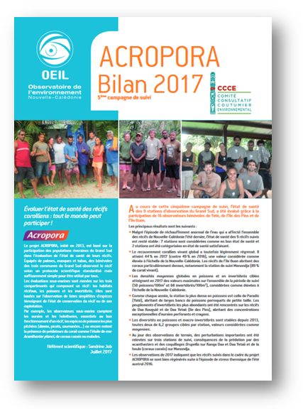 Les résultats de la cinquième campagne de suivi du projet Acropora sont en ligne. Depuis 2012, ce programme, coordonné par l’Observatoire de l’environnement (OEIL) et le Comité consultatif coutumier environnemental (CCCE), forme chaque année des bénévoles des populations riveraines du Grand Sud au suivi des récifs coralliens.