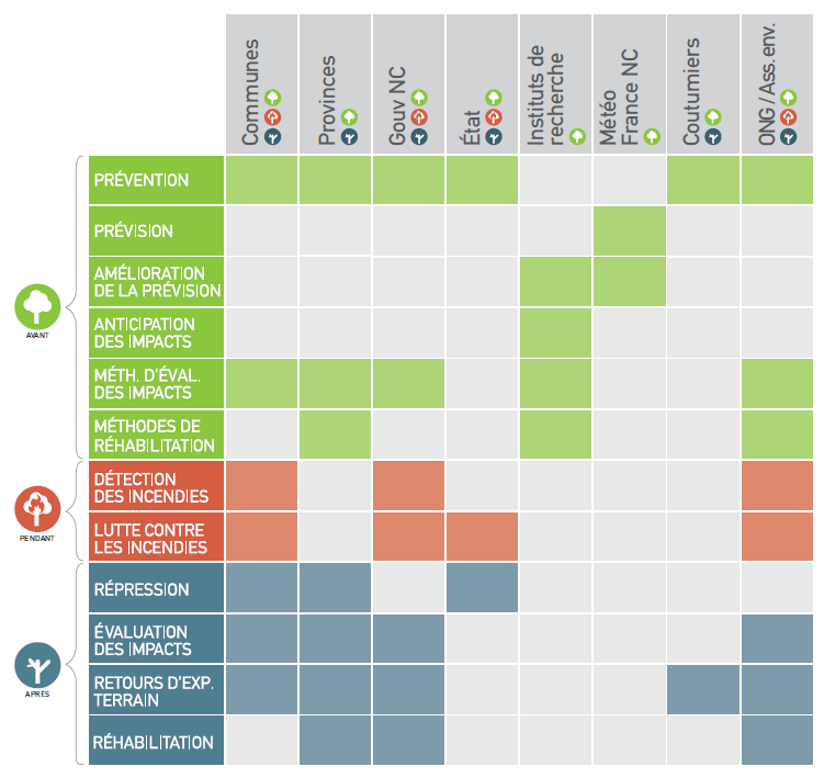 Les communes, les provinces, le gouvernement, les services de l’Etat, Météo France, les instituts de recherche, les ONG, les associations environnementales, les autorités coutumières : chacun, selon ses compétences, participe à la lutte contre les incendies tout au long de l’année. L’action des pouvoirs publics se fait selon une hiérarchie précise reposant sur les responsabilités de chacun, l’ampleur de l’incendie et donc les moyens à mettre en œuvre.