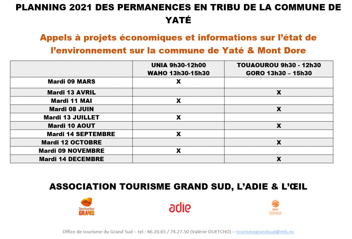 C'est une nouveauté 2021 : l'OEIL rejoint les permanences mensuelles dans les tribus de Yaté aux côtés de Tourisme Grand Sud et de l'ADIE ! Retrouvez ici le calendrier établi en accord avec les responsables coutumiers de chaque tribu, jusqu'à la fin de l'année.