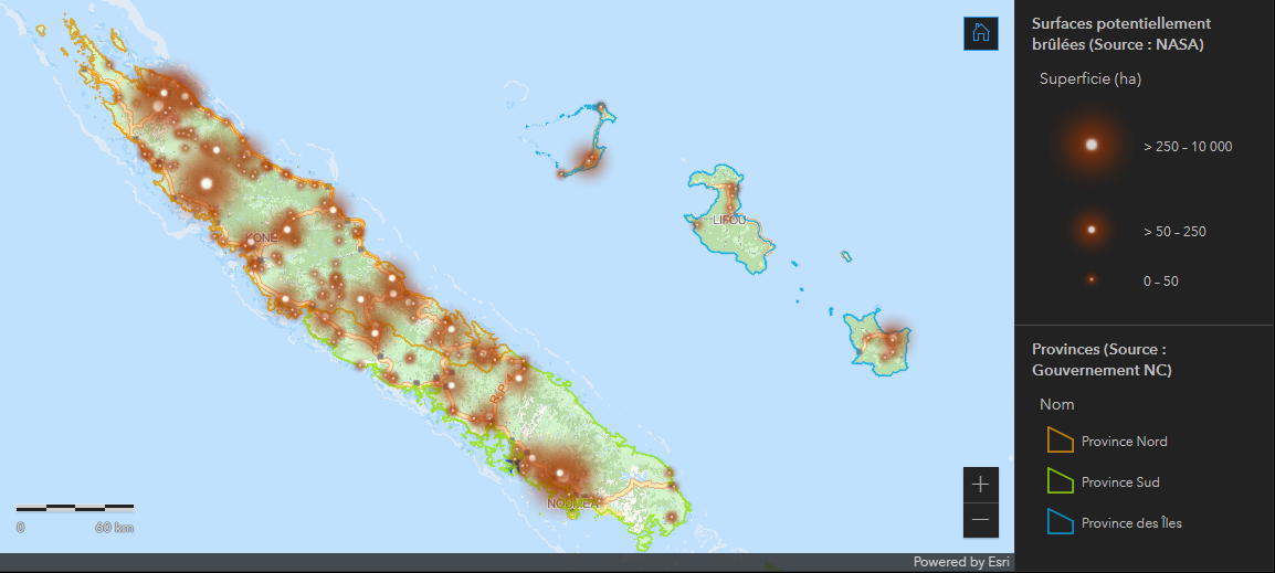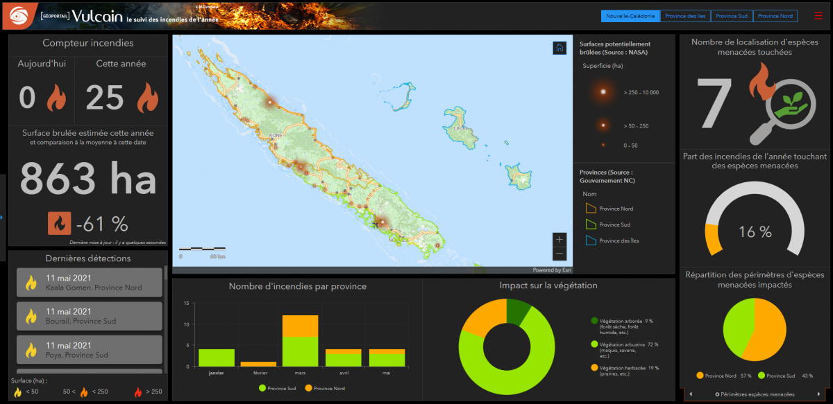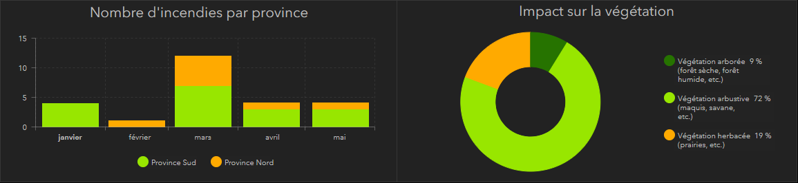 Le graphique présente la répartition par provinces des phénomènes détéctés depuis le 1er janvier de l'année en cours. Le diagramme en secteur présente les différents types de végétations impactés par les incendies détectés depuis le début de l'année. Ces données sont obtenus à l'aide des données du MOS 2014 (Mode d'Occupation des Sols) fournies par le gouvernement de la Nouvelle-Calédonie. |