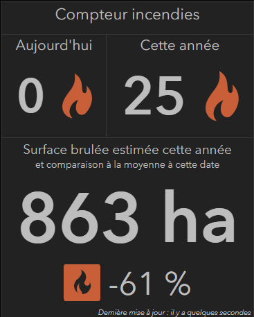 Les compteurs indiques le nombre d'incendies détectés aujourd'hui et depuis le début de l'année, ainsi que la surface concernée estimée. Cette surface estimée est comparée à la moyenne des surfaces brulées au même moment de l'année depuis 2013. Exemple : Ci-contre, on observe au 17/05/2021 une diminution de 61% des surfaces incendiées par rapport à la surface moyenne incendiée du 01/01 au 17/05 depuis 2013.