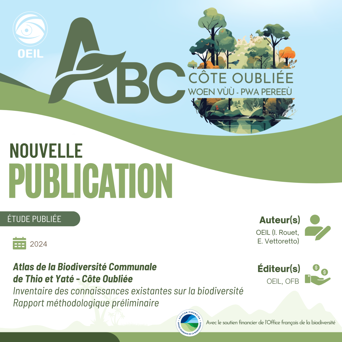 Résumé : En 2023, l'Observatoire de l'environnement en Nouvelle-Calédonie (OEIL) a obtenu le soutien financier de l'Office Français de la Biodiversité pour réaliser un "Atlas de la Biodiversité Communale (ABC) de Thio et Yaté - côte Oubliée - Woen Vùù - Pwa Pereeù", dont l'un des objectifs est d'établir un inventaire des connaissances existantes sur la biodiversité de la zone d'étude.
