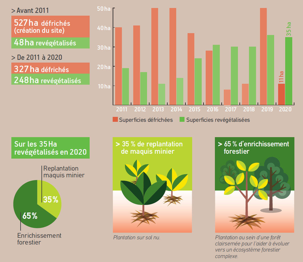 Depuis le début du projet industriel et minier du Sud, un total d’environ 850 hectares ont été défrichés. Pour compenser, des opérations de revégétalisation sont entreprises dans des zones qui ne risquent pas d’être exploitées dans le futur. Il s’agit de plantations de maquis minier au Parc provincial de la Rivière Bleue, d’enrichissement forestier au Pic du Grand Kaori ou encore de semis hydrauliques pour revégétaliser la verse de l’unité de préparation du minerai. Au total, 300 hectares ont été replantés de 2002 à 2020.