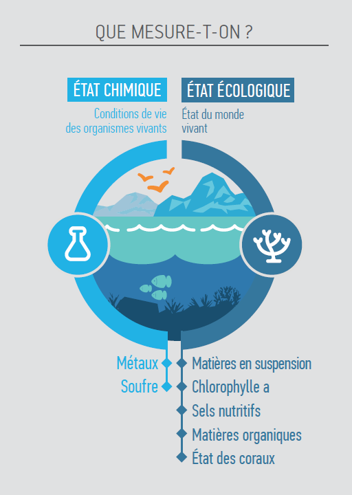 Bien que l’état chimique ne montre majoritairement pas de perturbation, on trouve des teneurs notables de manganèse, nickel et chrome dans l’eau et les sédiments. Principalement concentrés au niveau des baies Nord, Kwë et de Port Boisé, ces métaux sont issus des latérites exposées à l’érosion. Selon les zones, l’érosion est liée aux anciennes exploitations minières et forestières, aux défrichements plus récents du complexe de Prony Resources, auxquels s’ajoutent les incendies et les événements climatiques extrêmes. En ce qui concerne l’état écologique, un tiers des récifs suivis est perturbé. En baie de Prony et à l’île Ouen, la dégradation des coraux est principalement due à la prédation par les acanthasters, tandis que les récifs suivis plus au large sont soumis à de fortes houles pouvant casser les coraux.